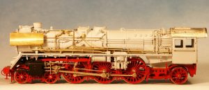 Das im Bau befindliche Modell 03 1046. Bereits montiert sind die neuen Zylinder und die angepasste Steuerung. Der grundierte Kessel ist mit zahlreichen Anbauteilen versehen. Die Position der Windleitbleche ist noch nicht korrekt und wurde noch einmal korrigiert.
