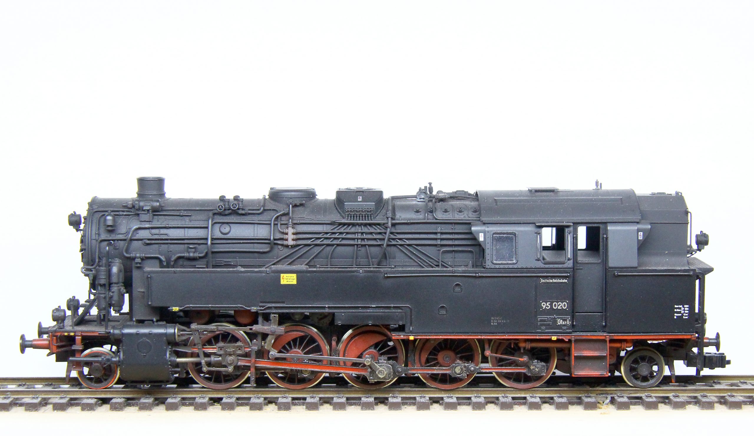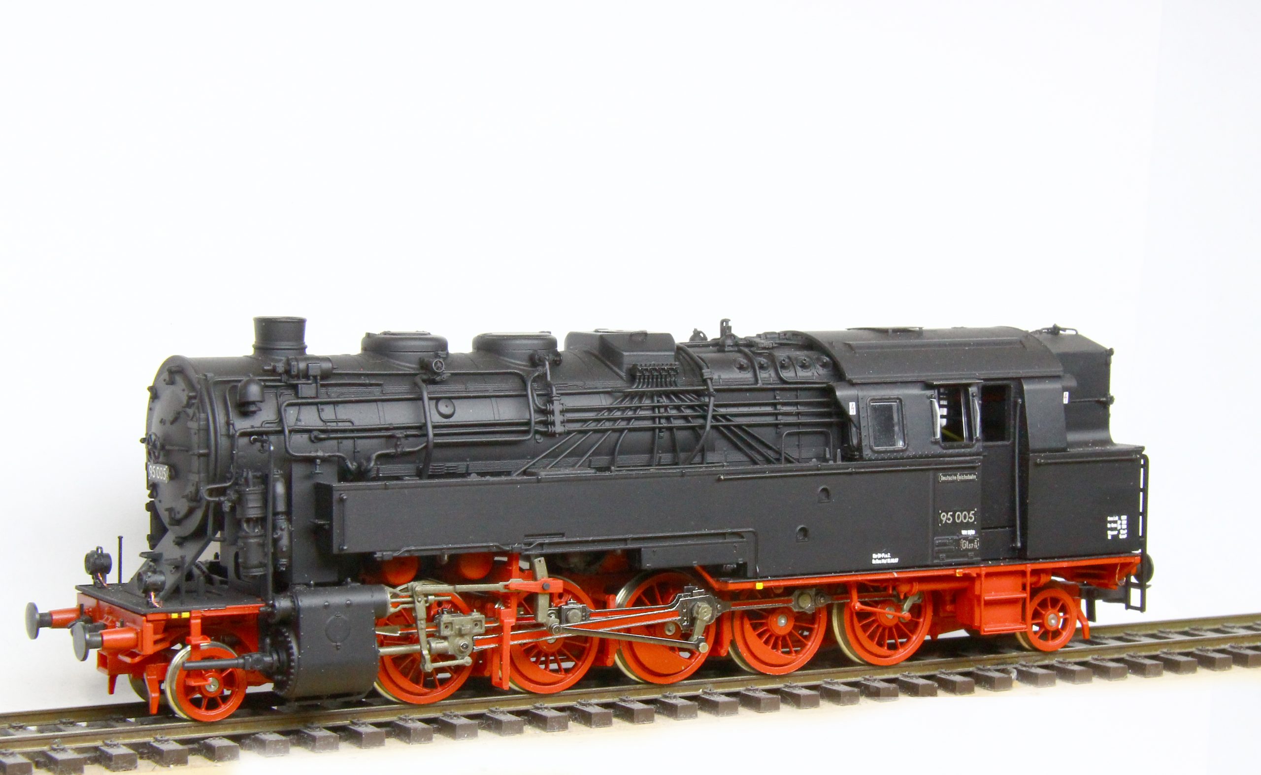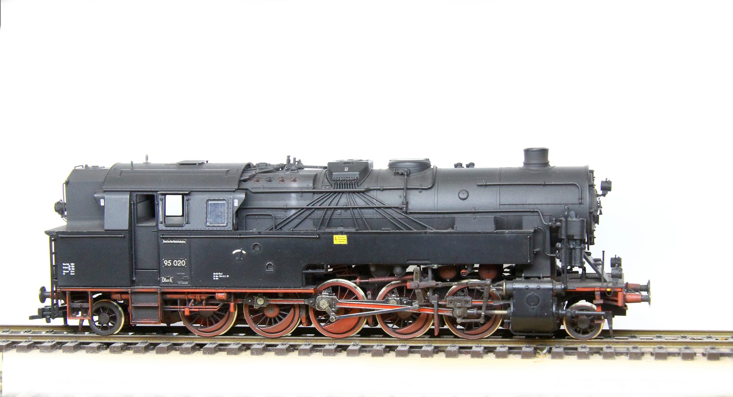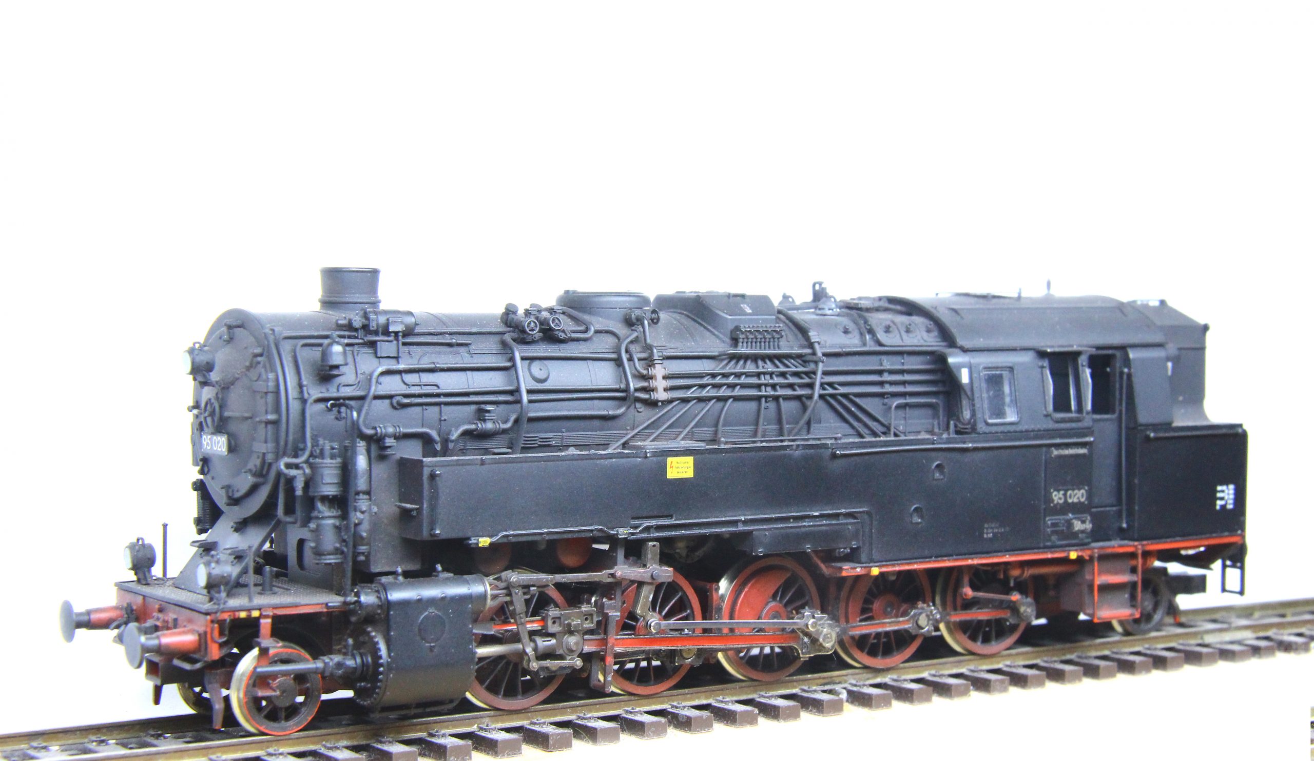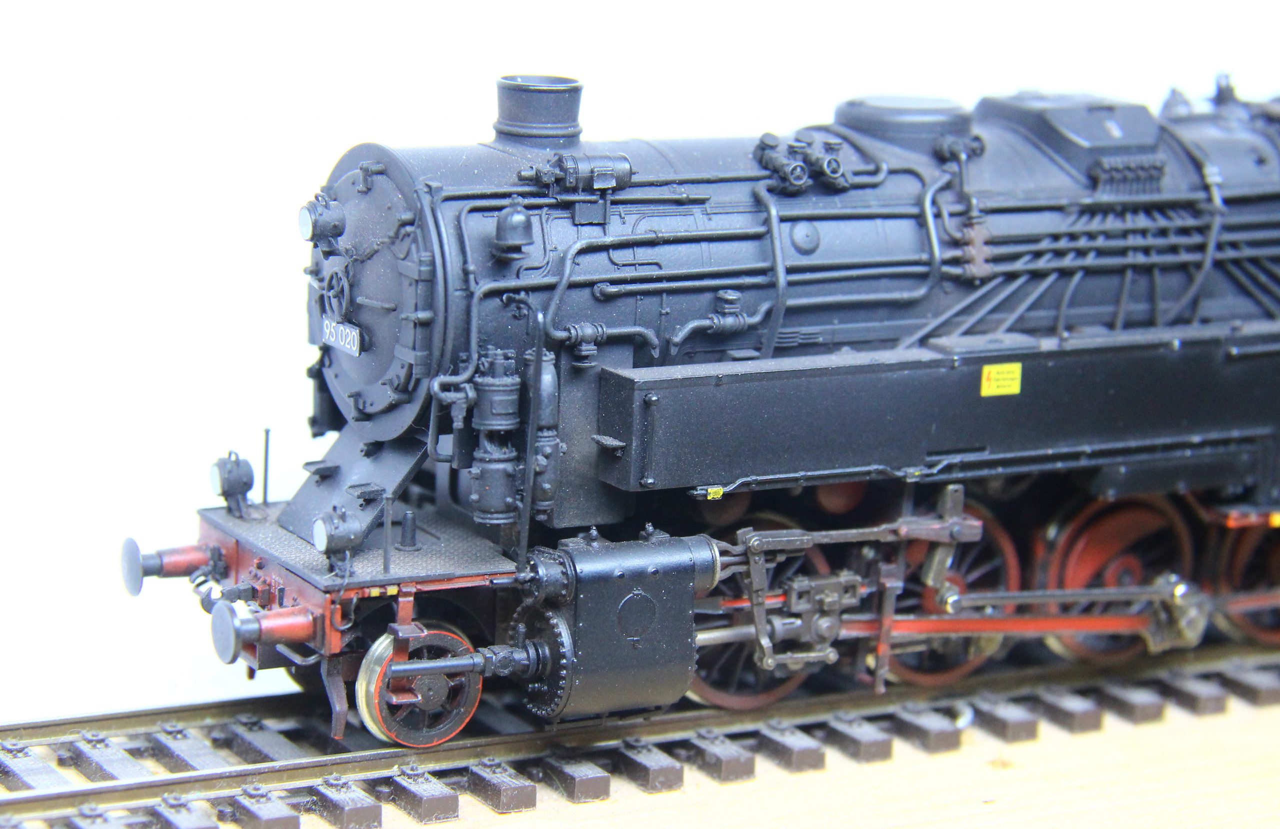 Als bekennender Epoche III-Fahrer musste ich natürlich auch das aktuelle Roco-Modell entsprechend modifizieren. Nach eingehender Recherche war klar, daß dafür einige Änderungen auszuführen sind. Wie auf den Bildern gut sichtbar, habe ich neben der Speisepumpe auch die Sicherheitsventile geändert, sowie auch die originalen Loklaternen gegen beleuchtete Weinertlaternen getauscht. Der Wasserkasten erhielt an den Stirnseiten einen Tritt, der beim Roco-Modell leider fehlt. Die im ursprünglichen Beitrag (hier) bereits angesprochenen Dampfeinströmkästen habe ich ebenfalls getauscht. Natürlich besitzt auch diese Lok Neusilberräder von Holger Gräler mit RP25 Profil. Sie läuft damit auf unserer Clubanlage völlig problemlos. Zum Schluss erhielt auch dieses Modell eine neue Beschilderung, nunmehr als Epoche III und die dazugehörigen Bremsgewichte von Gerd Kuswa sowie eine vorbildnahe Patinierung. Die 95 005 entstand wiederum aus einer preisgünstigen Museumslok, also der kohlegefeuerten 95 1027. Auch hier wurden die oben beschriebenen Umbauten vorgenommen, ergänzt durch den Tausch des Sanddomes gegen ein Druckteil sowie den ebenfalls gedruckten Ölbehälter. Darüber hinaus habe ich an dieser Lok auch die immer gebogenen waagerechten Griffstangen am Wasserkasten durch Messinggriffstangen ersetzt. Das Modell erhielt eine neue Lackierung und ebenfalls neue Schilder und Anschriften. Nun folgt noch letzte Anbauteile sowie auch an diesem Modell eine leichte Patina, um neben der 95 020 bestehen zu können.